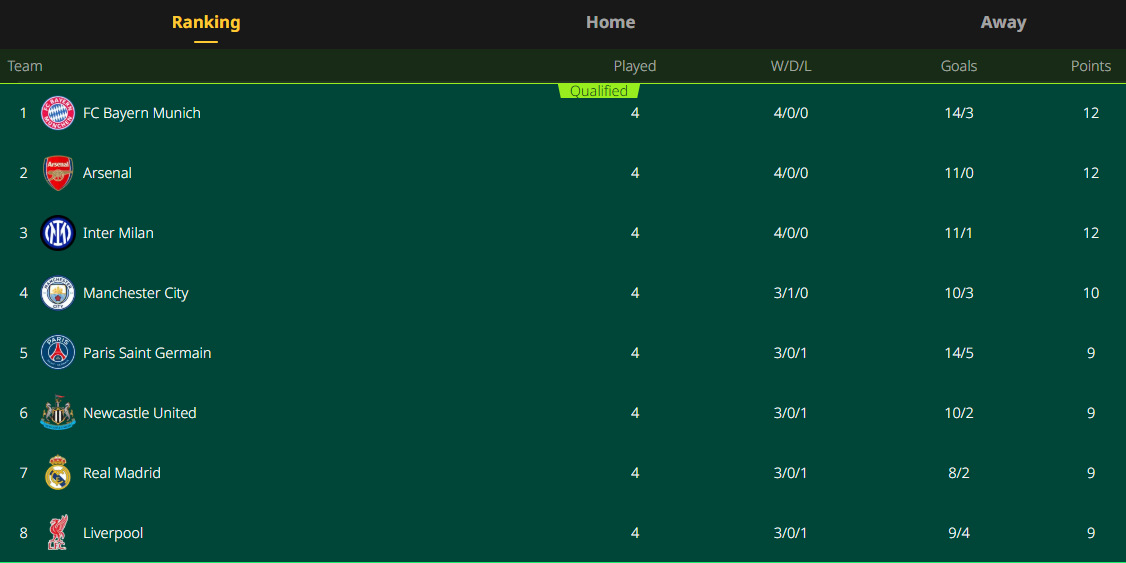 Bayern Munich: 4 wins in 4 matches, 12 points, 14 goals scored / 3 conceded (goal difference +11). Averaging 3.5 goals per match (No.1 in the Champions League) and 0.75 goals conceded per match (Top 3 in defense), the dual insurance of points and goal difference locks in qualification in advance.