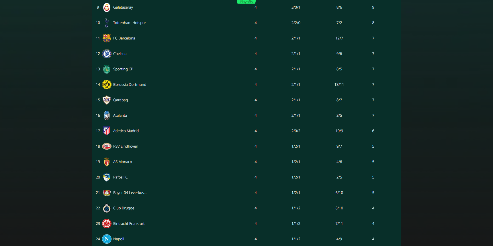 Galatasaray: 3 wins and 1 loss, 9 points, 8 goals scored / 6 conceded (goal difference +2). Victor Osimhen tops the Champions League scoring chart with 6 goals, supported by former Manchester City players İlkay Gündogan and Leroy Sané who orchestrate the midfield to continuously create opportunities for the forward line. If the team can gain points against Atlético Madrid and Manchester City in subsequent matches, it is likely to finish 7th to 16th.